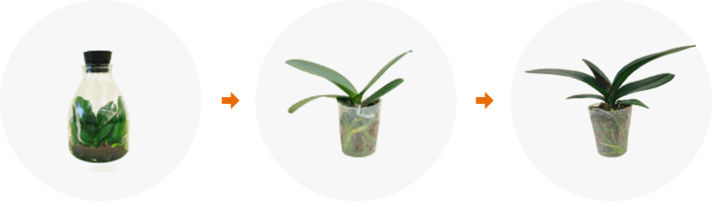実生苗で開花した中から選別を行いバイオ技術を用いてメリクロン苗を生産ここまでで約2年の期間が必要そこからフラスコ苗を取り出しプラスチックポットに植替え生育状況に合わせて小苗→中苗→大苗